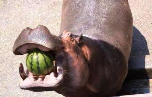 你看,当河马用嘴巴咬住西瓜时,它会用牙齿将西瓜分成几块,然后一块一块地吃下去。这种吃瓜技巧,真是让人叹为观止。